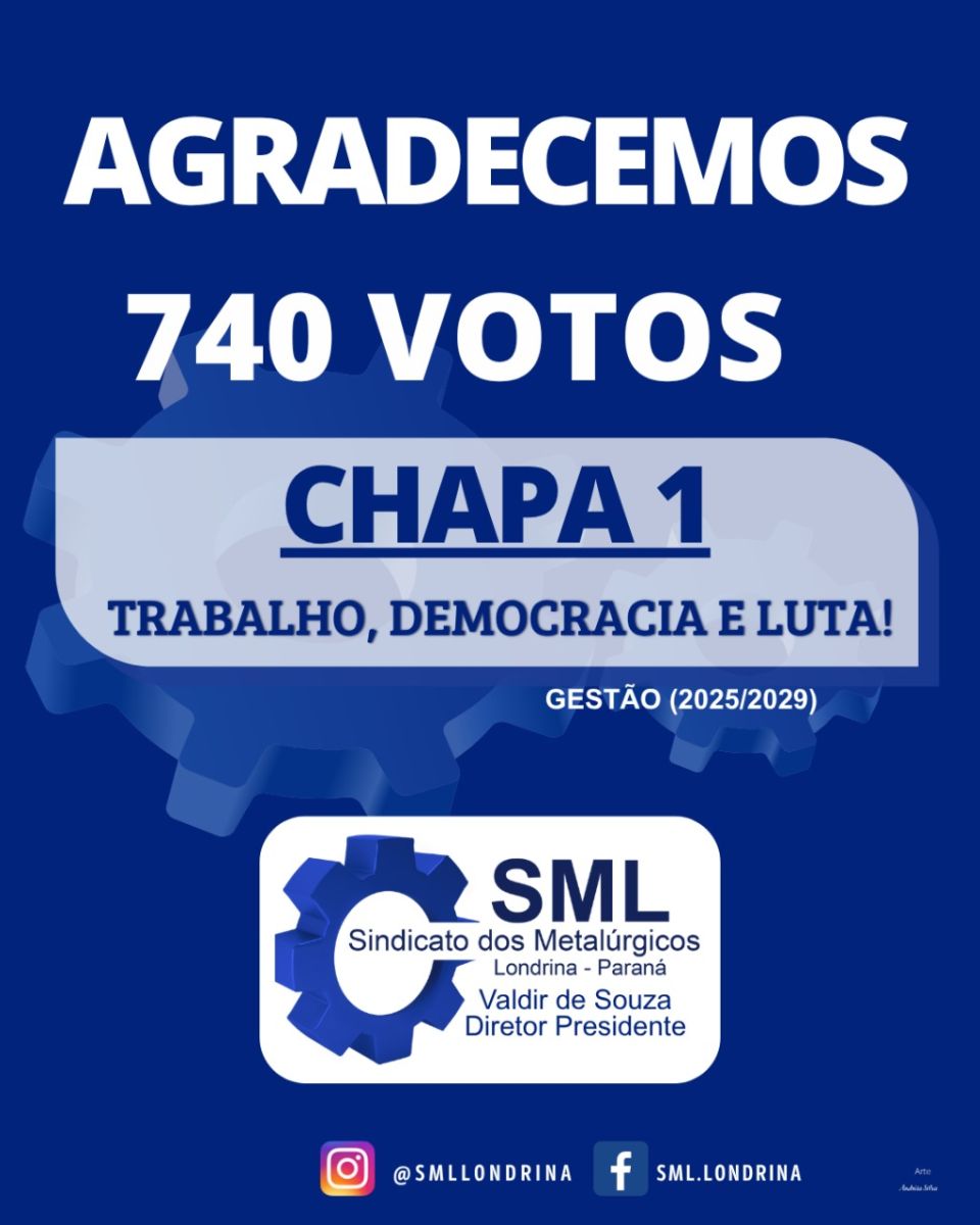 As eleições do Sindicato dos Trabalhadores nas Indústrias Metalúrgicas, Mecânicas e de Material Elétrico de Londrina e Região (SML) terminaram na tarde desta terça-feira (08), com a contagem dos votos finalizada após dois dias de votação. A Chapa nº. 1, sendo a única na disputa, foi amplamente aprovada, garantindo a continuidade da gestão atual para o mandato de 2025 a 2029.
